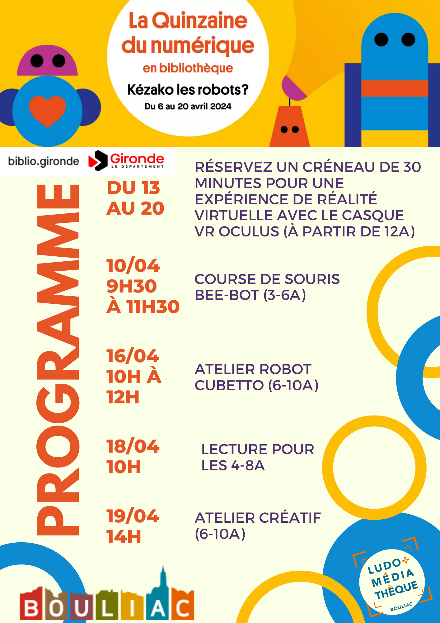 - Et pour les plus grands à partir de 12 ans : Réservez un créneau de 30 minutes pour une expérience de réalité virtuelle avec le casque VR OCULUS. En continu sur réservation pendant la quinzaine du numérique du 13 au 20 avril 2024.
