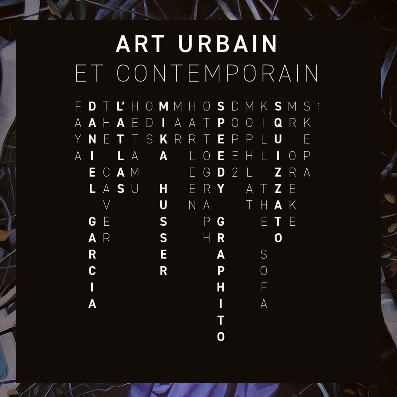 Aperçu des artistes présentés, : FAYA, Daniel GARCIA, SKEPA, Martin KRUSCHE, SPEEDY GRAPHITO, SQUIZZATO, L’ATLAS, MAR, Mika HUSSER, MR Oreke, Mophlat, Dope2, Ottograph, HETAMU, The Caver…