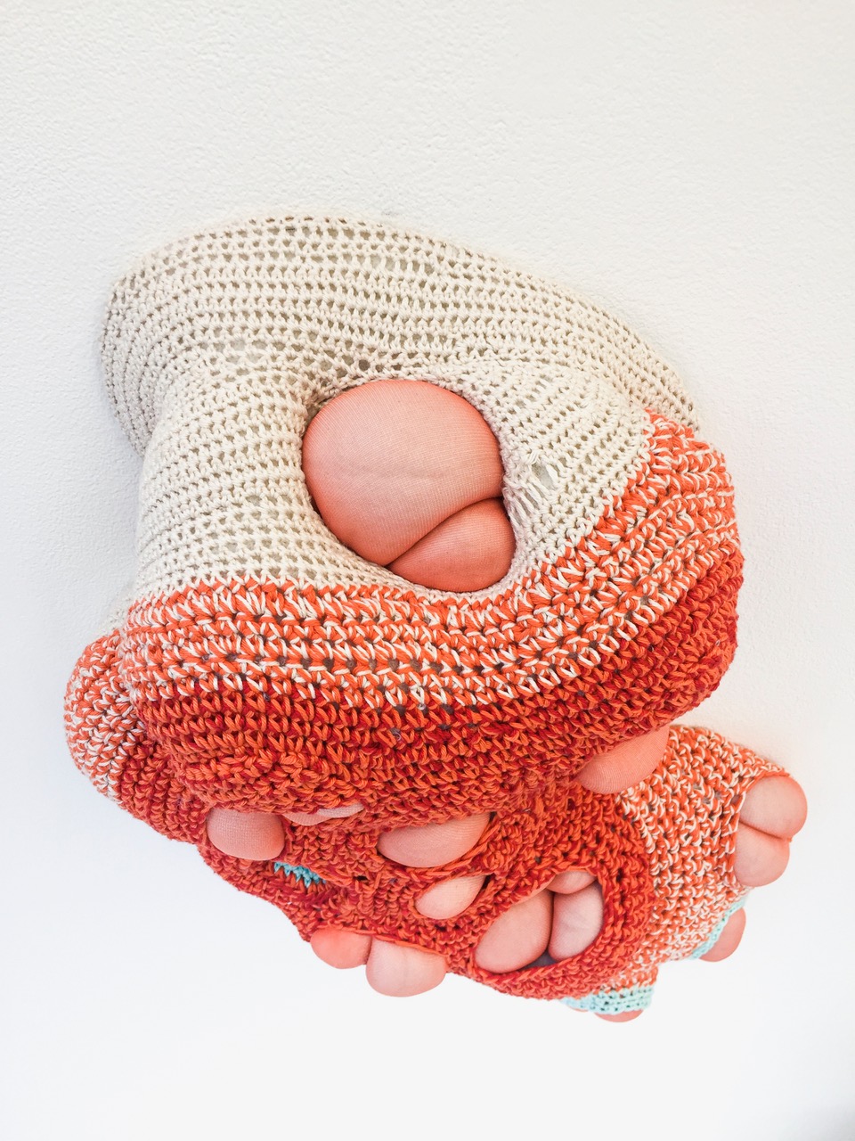 Ma démarche est de l’ordre de l’intime comme voyage à l’intérieur de ce temple qu’est l’organicité de notre espace corps. J’explore, je scrute, je m’engouffre dans ses failles que je souhaite révéler à l’œil nu en proposant des pièces de tailles variables. La relation que j’entretiens avec le microscopique reste le point d’appuis, pour entamer ce voyage souterrain intra organique. Ces observations donnent lieu à des modélisations détaillées. Chaque micro observations me conduit à une production qui pourrait être infinie. Je m’appuie sur ce que je vois pour construire mon propos. A l’’image d’un gant retourné, mes installations proposent cet en deçà que l’œil seul ne peut capter. Les dimensions XXL des pièces, disposées, agencées dans des espaces clos sont comme des mises en culture et prolifèrent. Véritables rhizomes cellulaires, elles se propagent, se multiplient, s’agglutinent dans le milieu de culture qui leurs sont offerts. Cette propagation s’articule dans l’espace donné aussi bien d’un point de vue formel que d’un point de vue sémantique, attaquant, questionnant l’intime. Elle convoquent ces Golems contenus dans le corps en devenir, comme dans le corps sociétal. Nées de la fibre de coton ou du bas, de cheveux, matériaux issus de la féminité, les formes polylobées, lisses ou cicatricielles racontent leur histoire, révèlent notre histoire. Dans une volonté de proposer un regard incisif, leur apparence douce, présentent une lecture feuilletée où le monstrueux est distancié par sa facture esthétisée, comme un rappel à l’ordre, une présence alerte, indice dénonçant l’acidité du propos. La mise en tension des matières approche la fragilité de l’être. Mes médiums sont multiples. Leur matérialité, leur plasticité sont guidés par le questionnement voulu. Mon travail est prolifique, généralement conçu in situ. Les pièces présentées sont étudiées pour dialoguer avec l’espace de présentations. Me laissant guider par le fil, la mine, l’objet, l’objectif, le pixel, mes pièces questionnent la posture du chercheur manipulateur de l’hybride face à l’homme. Cette démarche découle de recherches précédentes sur la peau comprise non comme surface mais comme espace. J’explore la peau en m’appuyant entre autres sur les écrits de Didier ANZIEU. La peau devient espace «peaucien», une sorte d’Etre au sein duquel peuvent s’opérer manipulations, observations, distorsions. A l’issue de quoi, je crée un laboratoire d’expérimentations plastiques. Ma recherche esthétique se tourne alors vers l’étude microscopique de la peau d’où naissent des pièces explorant l’hybridité et le clonage ouvrant ainsi sur une réflexion questionnant les enjeux de la science sur notre appréhension de la société de l’image du corps. Mes axes d’étude questionnent la singularité de chacun mis en exergue dans une société normée, tendant vers le formatage d’une société «peau-lissée», voire «policée» dans son apparence. Dans cette volonté de calibrage, je perçois implicitement la volonté de négation de la notion d’individu. Le corps devient support, étoffe de l’apparence dont il force la mise en avant. Sous elle, il tend à disparaitre. Dans mon travail, le corps dans toute son organicité s’impose avec ces différences, ses difformités. Corps mutant ou révélant son processus de mutation, monstrueusement offert, il est mis en avant, affirmant son individualité. Par une pratique prolifique, la singularité se répand à la manière d’un blob. ( Organisme unicellulaire, ni animal, ni végétal, ni champignon. dépourvu de cerveau, le blob apprend, transmet et fusionne avec ses semblables). Les installations que je propose évoquent cette prolifération hétérogène de la singularité qui tendraient à une homogéneité . Ainsi, l’anormalité ne se pourrait elle se faire norme?